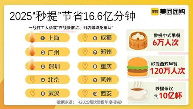 在大城市中,像李钰这样的用户不在少数。《秒提报告》显示,2025年,全国各地的秒提意愿普遍上扬,上海用户秒提下单最踊跃。广州、深圳、北京紧随其后,与武汉、成都、郑州、重庆、杭州、西安,共同跻身全国十大餐饮秒提之城。