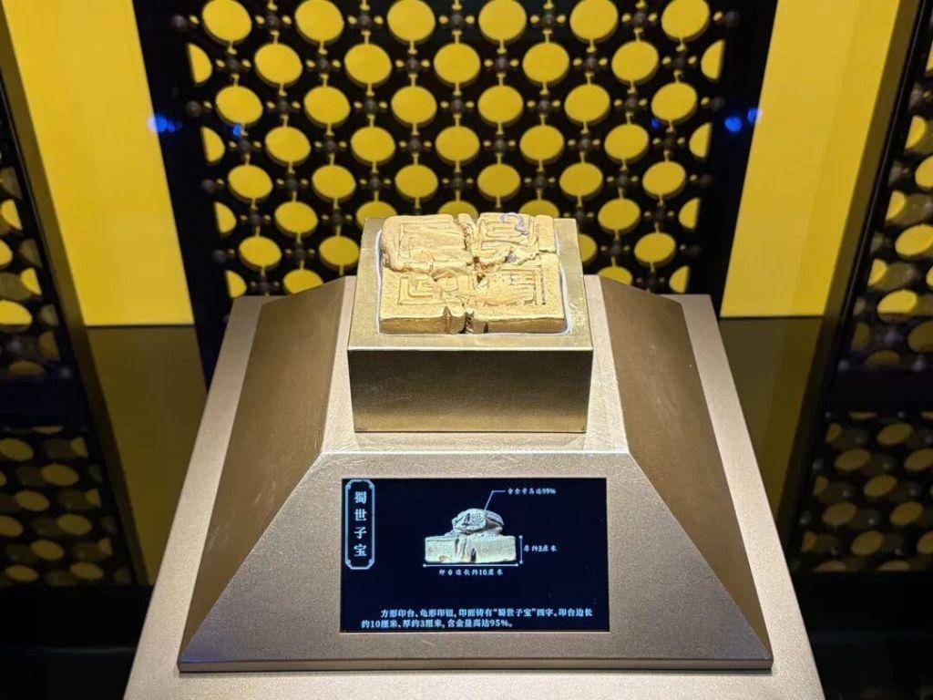 据四川媒体报道,展厅内可谓金光熠熠,金币、银锭、金银扣、金银首饰等金银器文物成排展示,规模恢宏。镇馆之宝之一的“永昌大元帅印”,含金量高达95%的“蜀世子宝”金印、“足金五十两”金锭等悉数展出