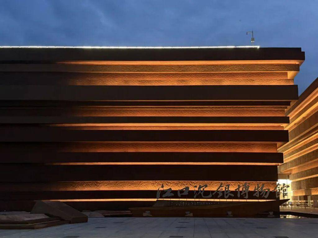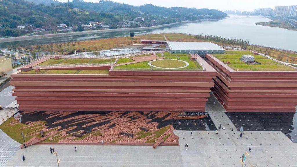 江口沉银博物馆坐落于眉山市彭山区,紧邻江口沉银遗址,建筑面积3.63万平方米,展陈面积约7800平方米,按国家一级博物馆标准建设。其外墙设计参考了遗址所在河道的红砂岩基岩,肌理层叠起伏,仿佛刚从江水中“生长”而出,与周边的山水浑然一体。