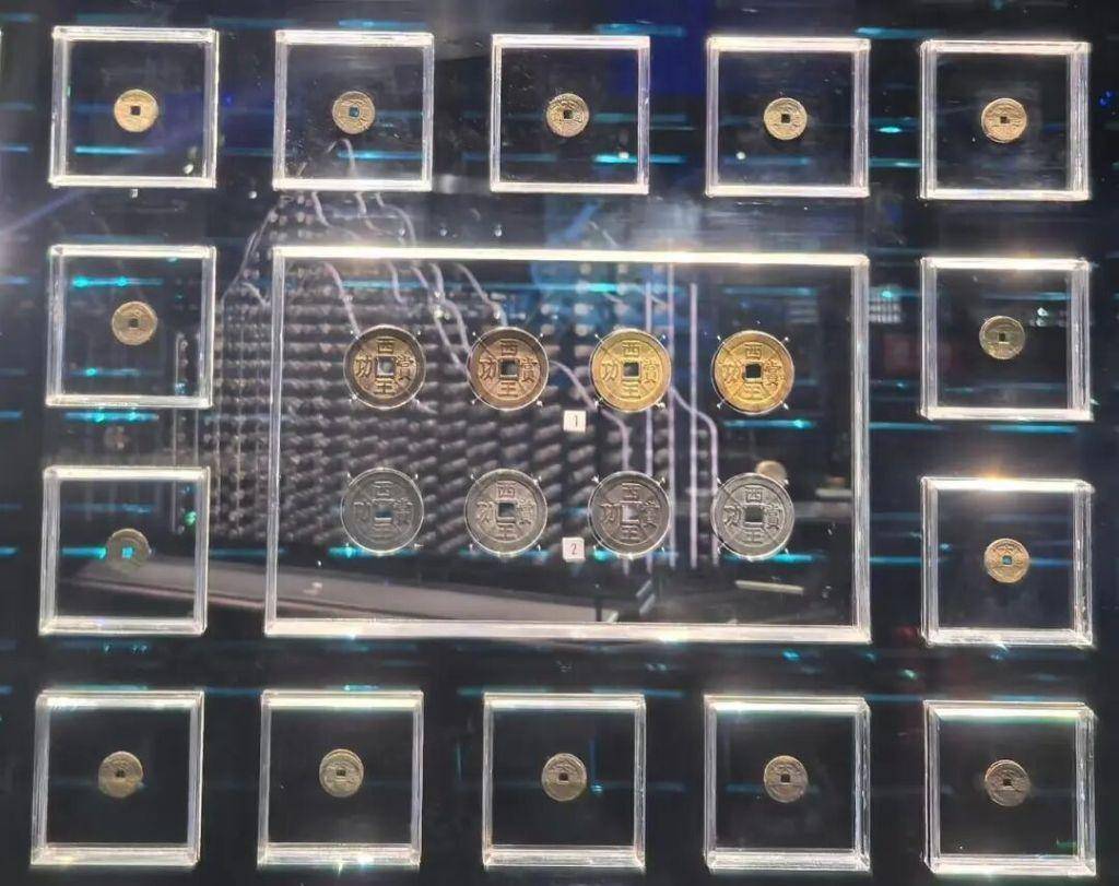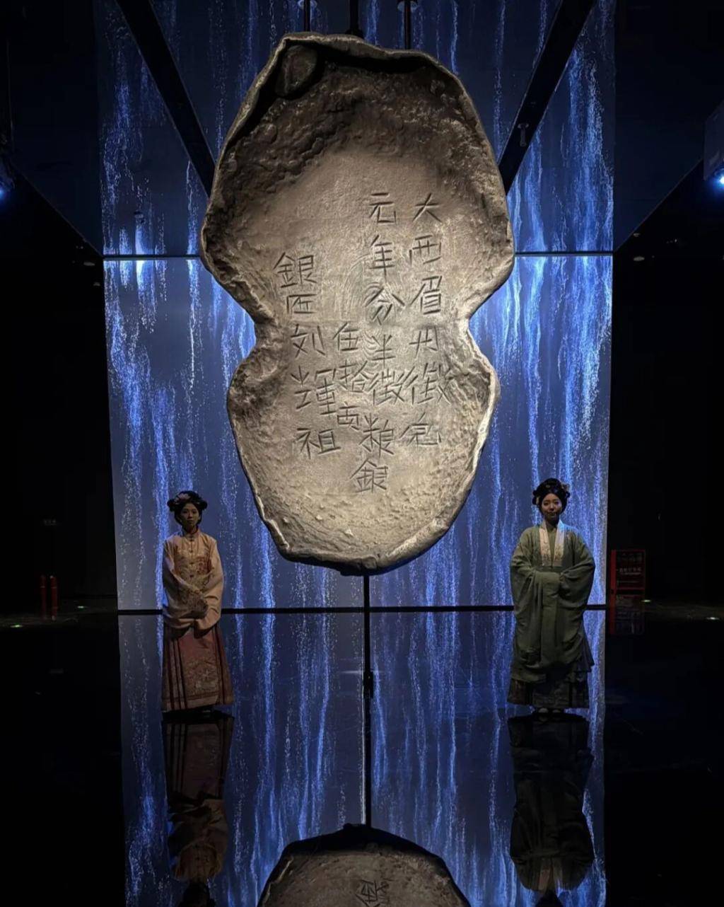 展馆内还有多处极具视觉冲击力的打卡点:一块3米高的巨大“银锭”工艺品,泛着冷峻的金属光泽,还原了明代百两银锭的震撼体量;一堵由数百枚银锭镶嵌而成的“银锭山”,在灯光下银光熠熠,构成一座金字塔般的“财富之山”,吸引了众人拍照留念。