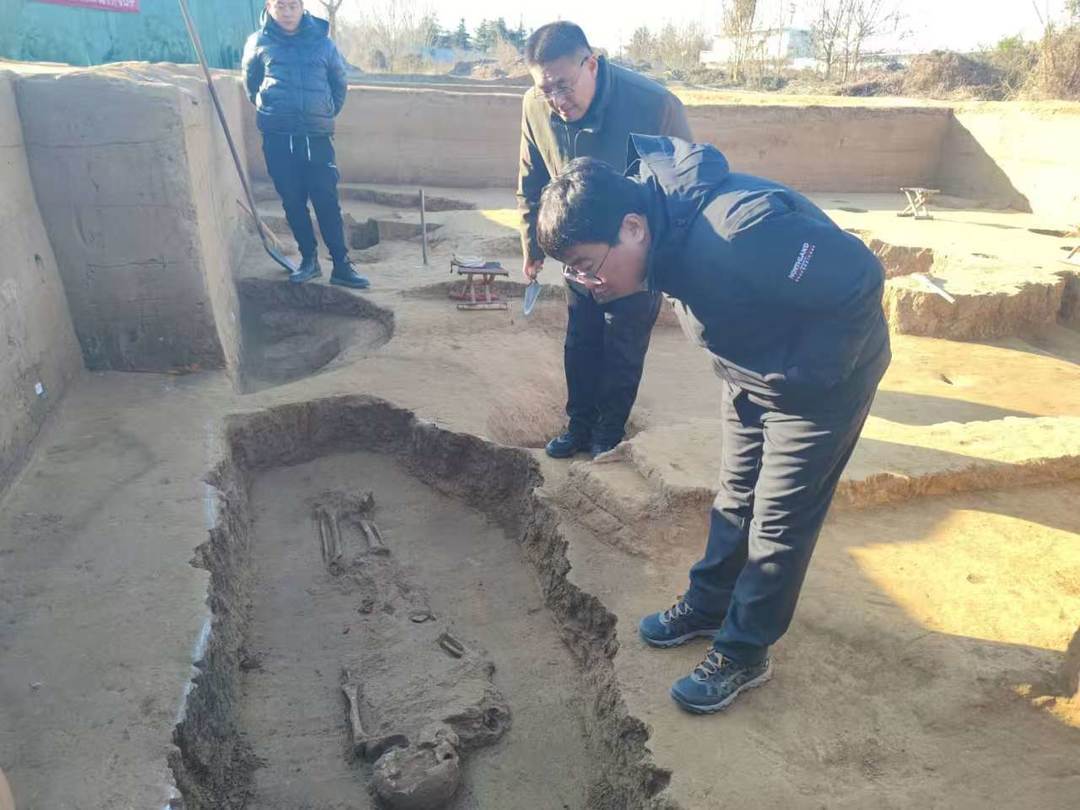 考古人员清理到墓坑底部时,发现人骨一具,保存基本完整。其葬式为俯身直肢葬,脊椎尾部向左侧弯曲,头向东,面向北,左右两手压于盆骨两侧下方。墓主身高约1.70米。墓内未见葬具及随葬品。经山东省文物考古研究院肖雨妮鉴定,墓主为50-60岁中老年男性个体。